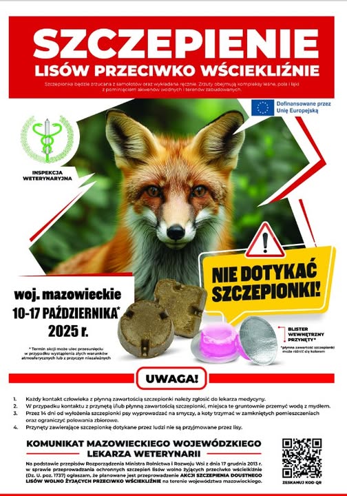 W dniach 10–17 października 2025 r. na terenie województwa mazowieckiego przeprowadzona zostanie akcja szczepienia lisów wolno żyjących przeciwko wściekliźnie.