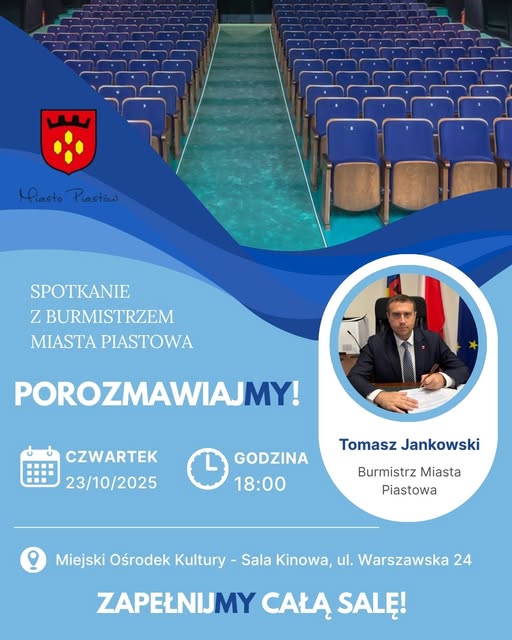 W czwartek, 23 października 2025 r. o godzinie 18:00, zapraszamy wszystkich mieszkańców na spotkanie z Tomaszem Jankowskim - Burmistrzem Miasta Piastowa.