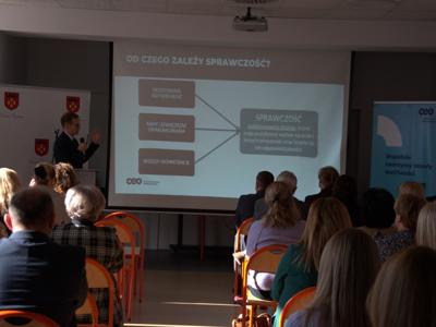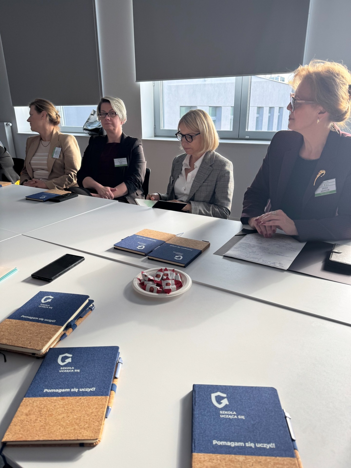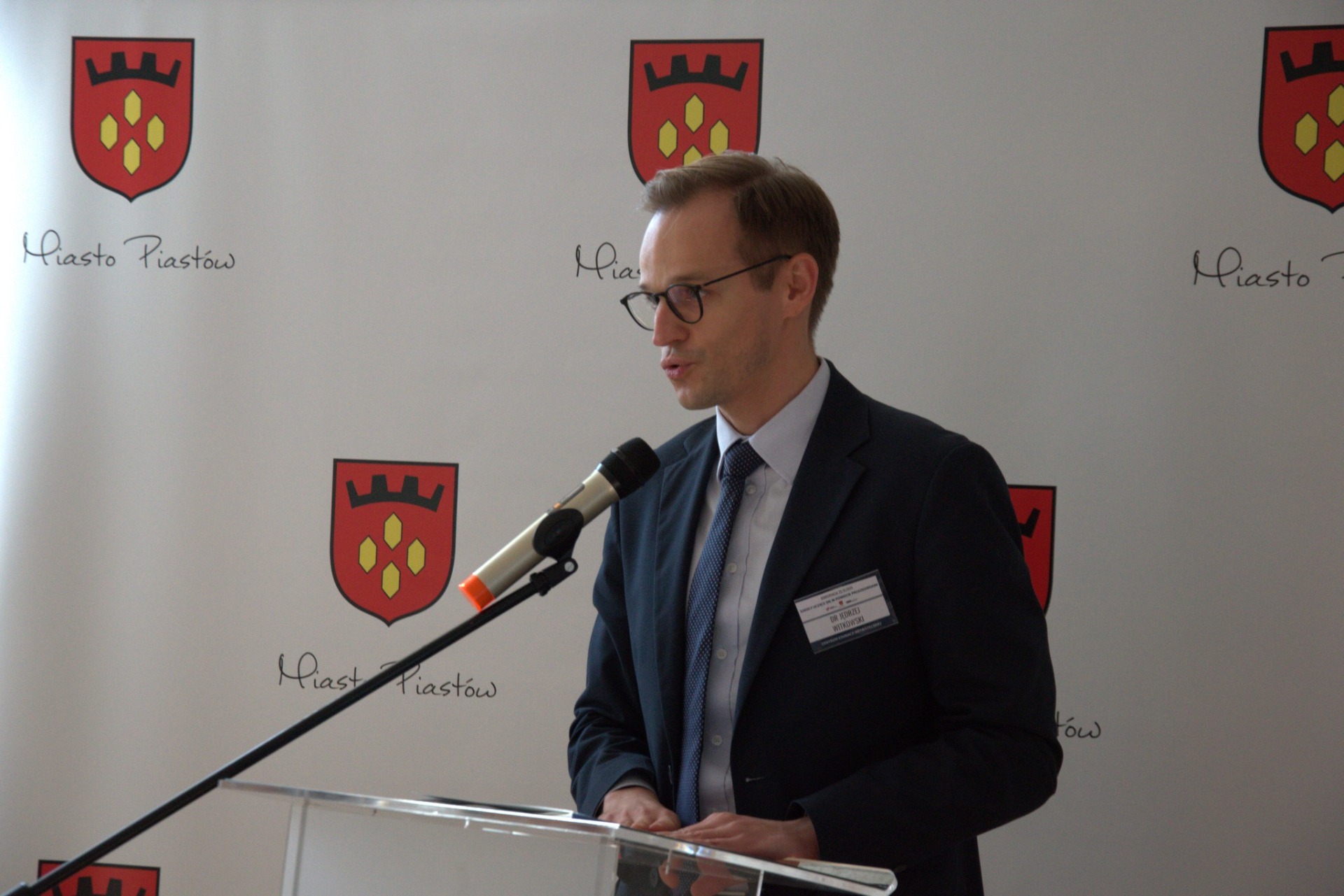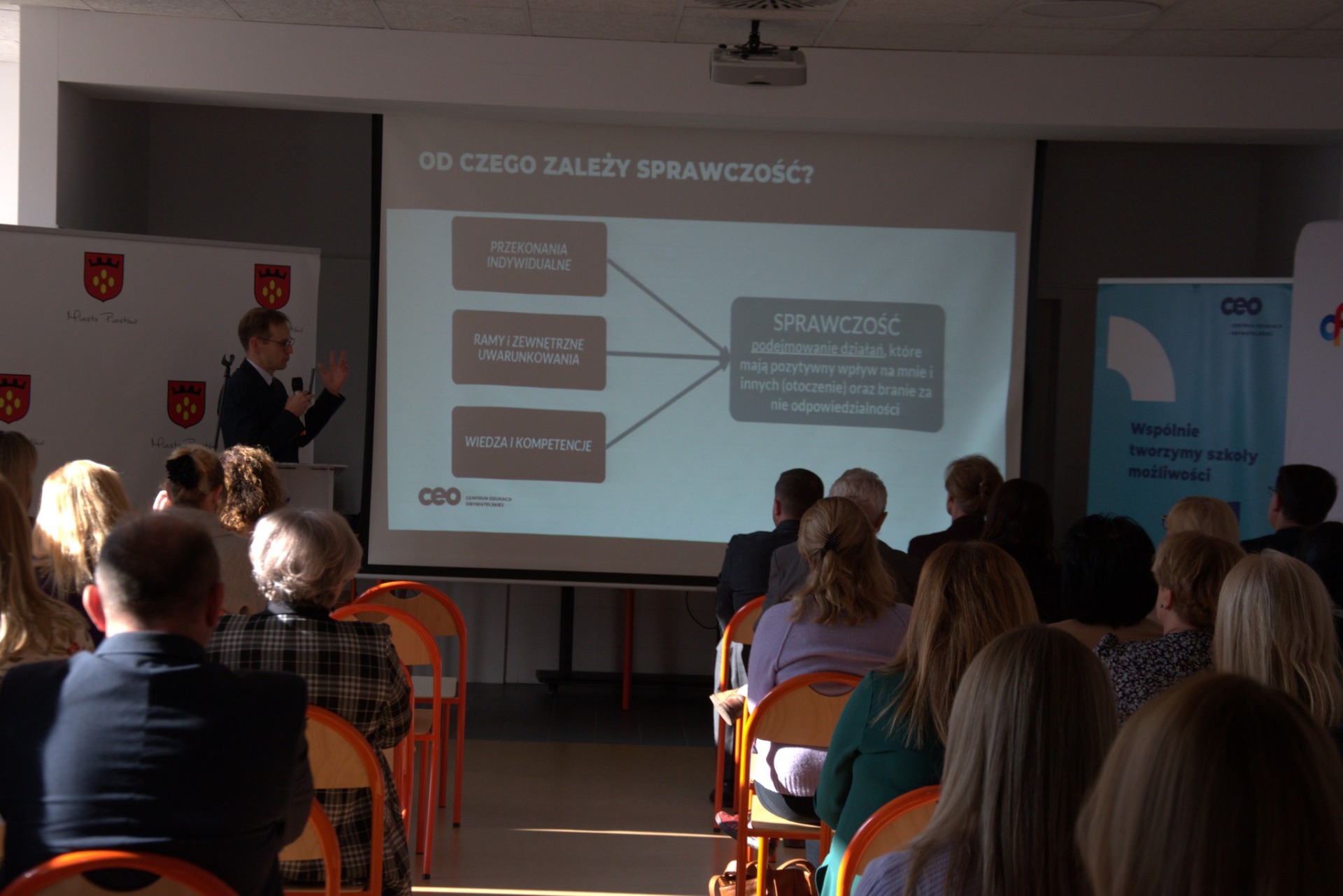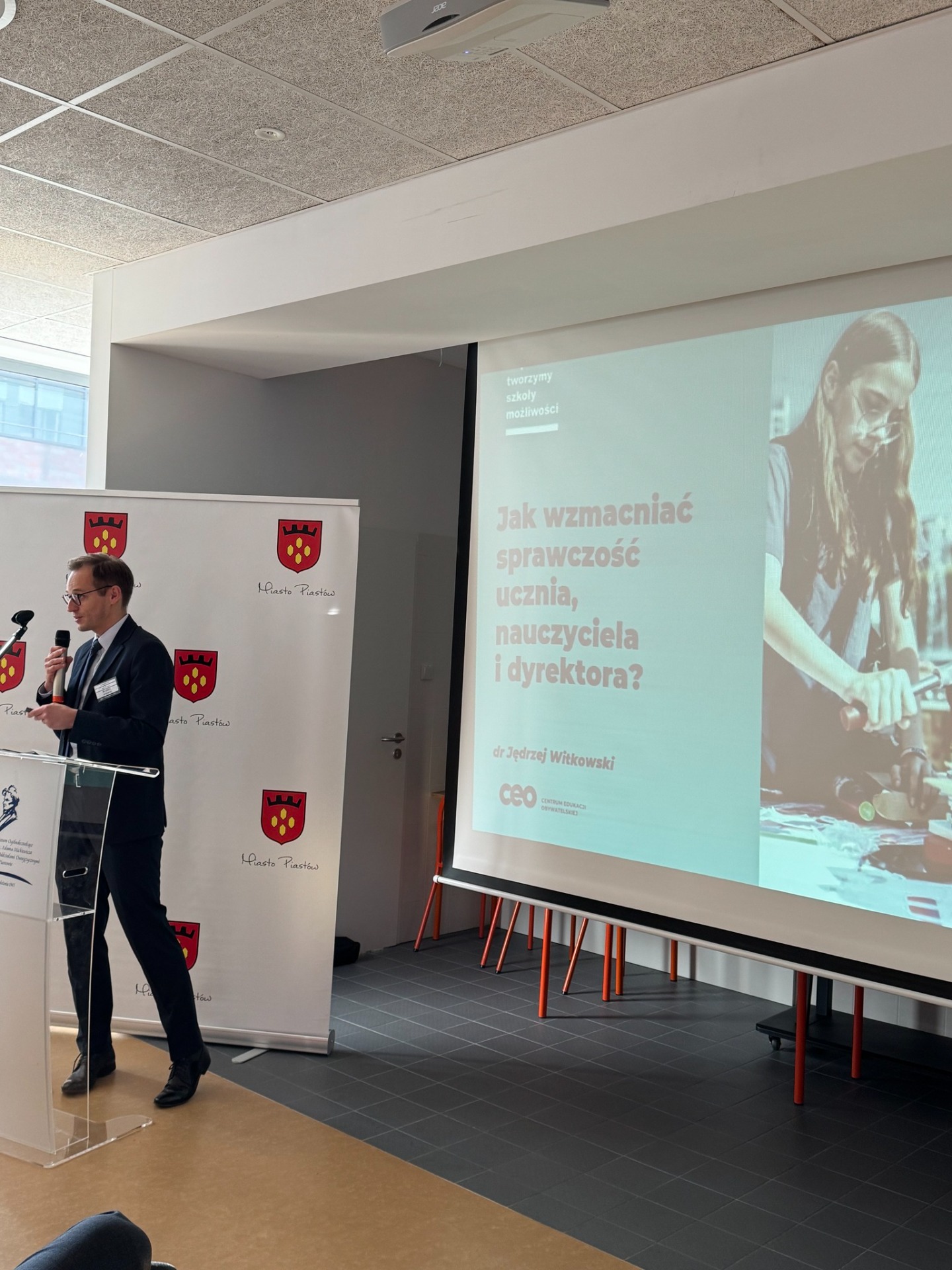 dialog z przedstawicielami samorządów: "Czyja jest szkoła publiczna? Jak o nią dbać i czego oczekiwać?" - poprowadzone przez Prezesa Zarządu Centrum Edukacji Obywatelskiej (CEO) Jędrzeja Witkowskiego, Iwonę Kluge Zastępczyni Dyrektorki działu „Szkoła ucząca się” oraz Zastępczynię Burmistrza Miasta Piastowa - Urszulę Skrzypczak.