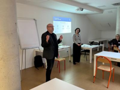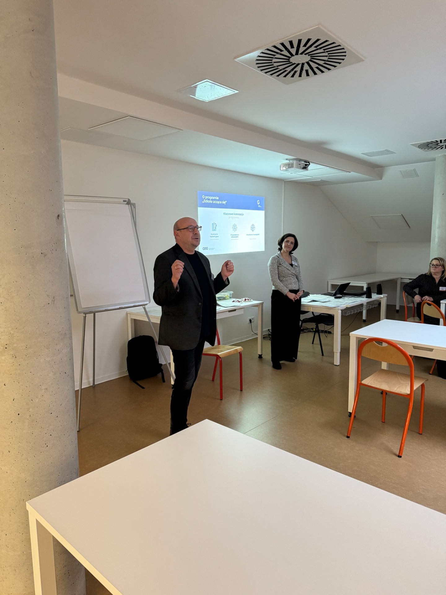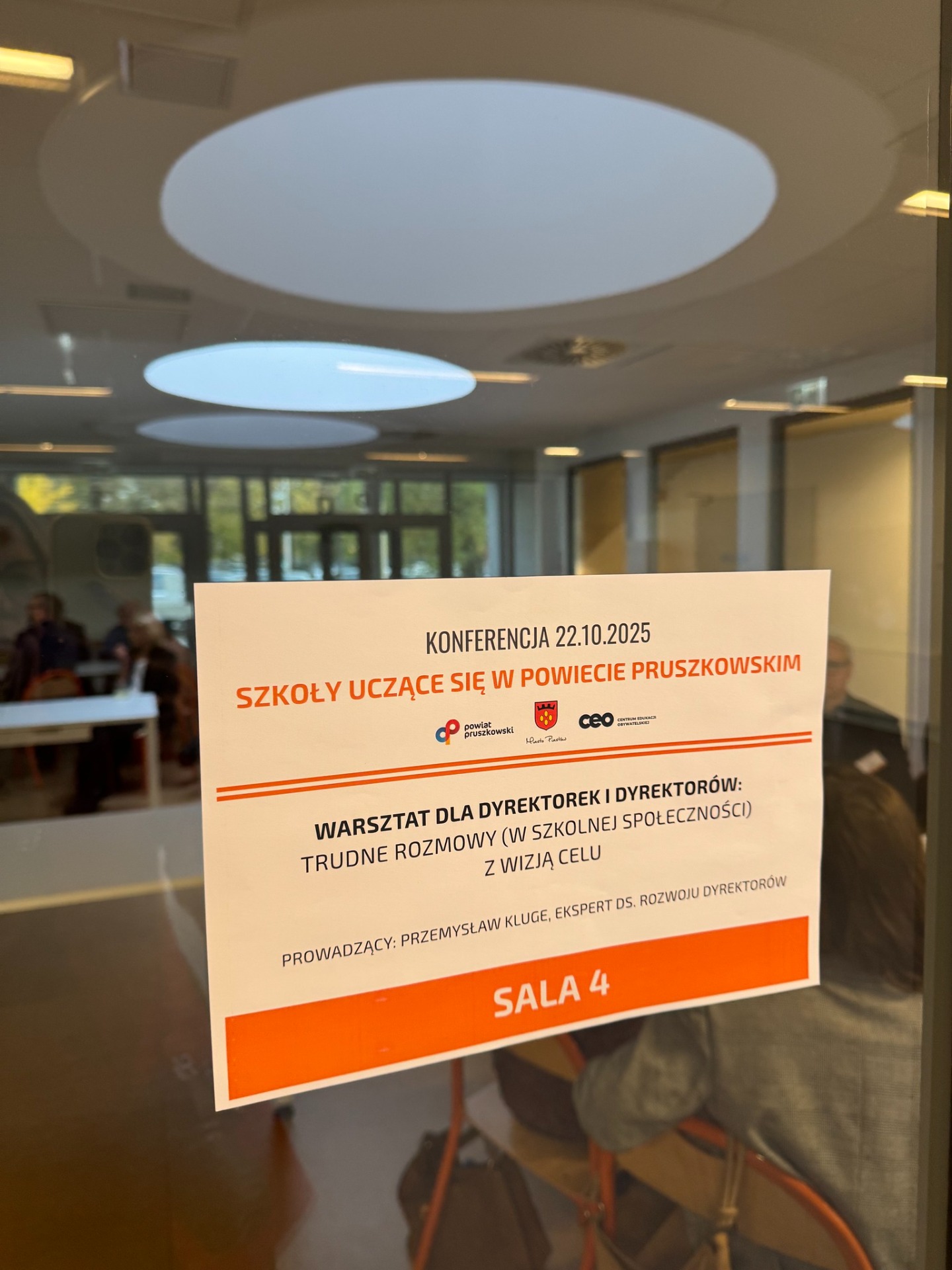 warsztat dla dyrektorek i dyrektorów: "Trudne rozmowy (w szkolnej społeczności) z wizją celu" poprowadzony przez Przemysława Kluge - eksperta ds. rozwoju dyrektorów
