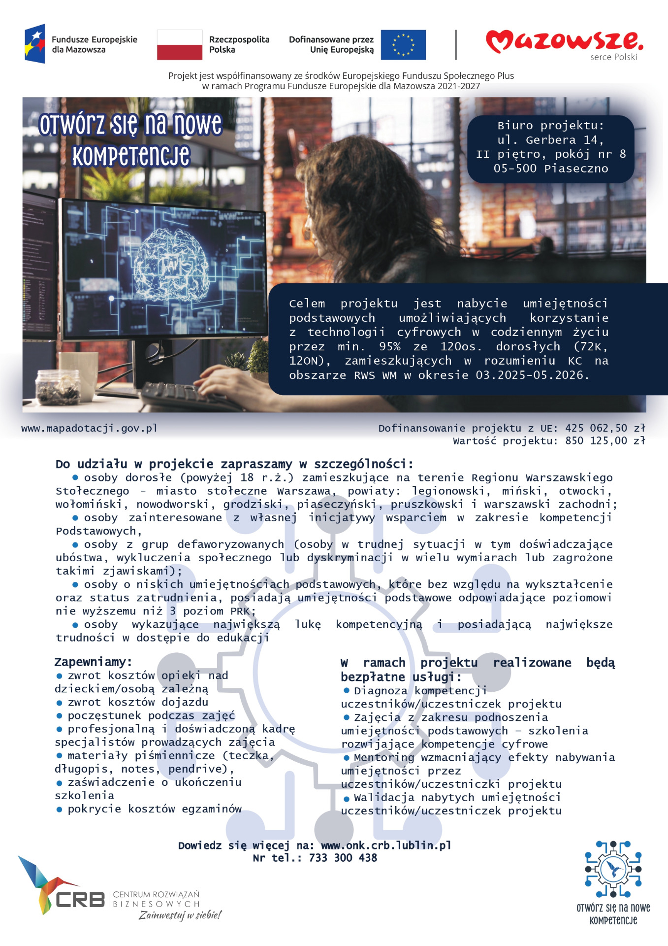 Fundacja Centrum Rozwiązań Biznesowych realizuje projekt: „Otwórz się na nowe kompetencje”, który jest współfinansowany ze środków Europejskiego Funduszu Społecznego Plus w ramach Programu Fundusze Europejskie dla Mazowsza 2021-2027.