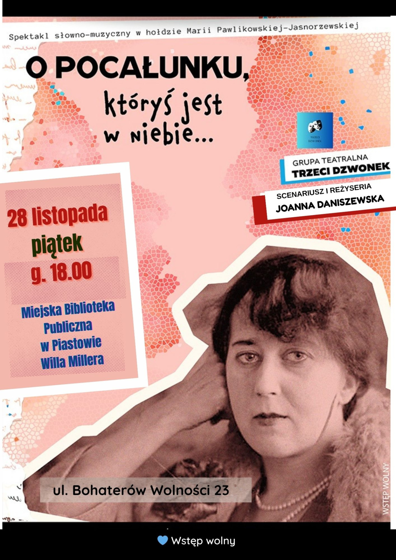 Serdecznie zapraszamy na spektakl słowno-muzyczny w hołdzie Marii Pawlikowskiej-Jasnorzewskiej pt. „O pocałunku, któryś jest w niebie”.