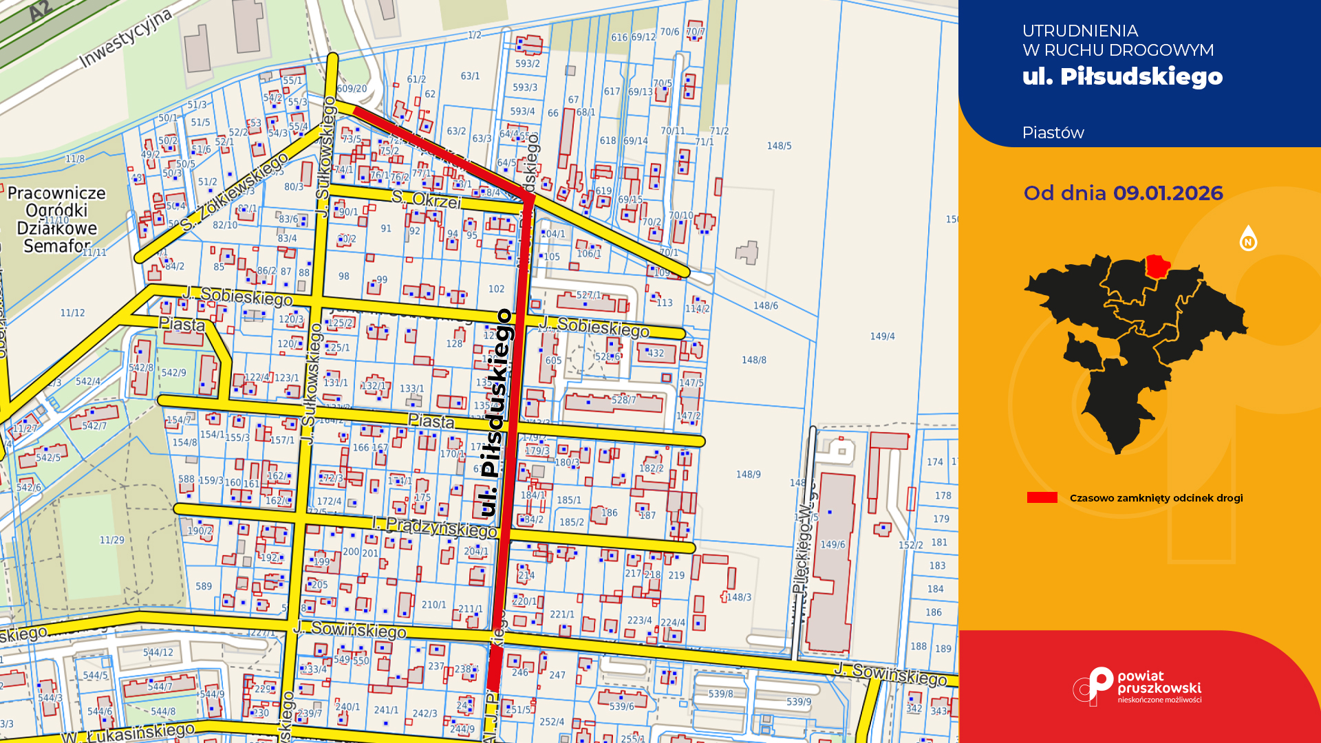 Od 9 stycznia 2026 r. zamknięty zostanie odcinek ul. Piłsudskiego w Piastowie – między ul. Sowińskiego a ul. Lisa-Kuli.