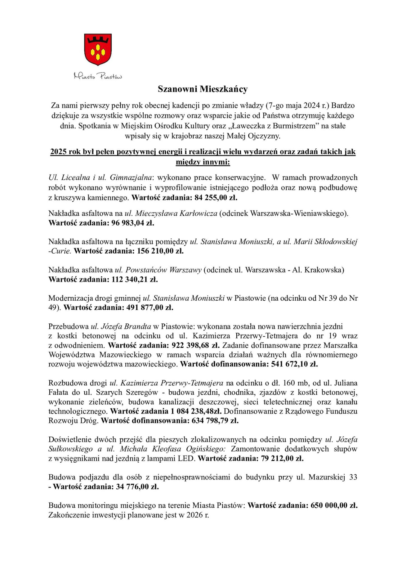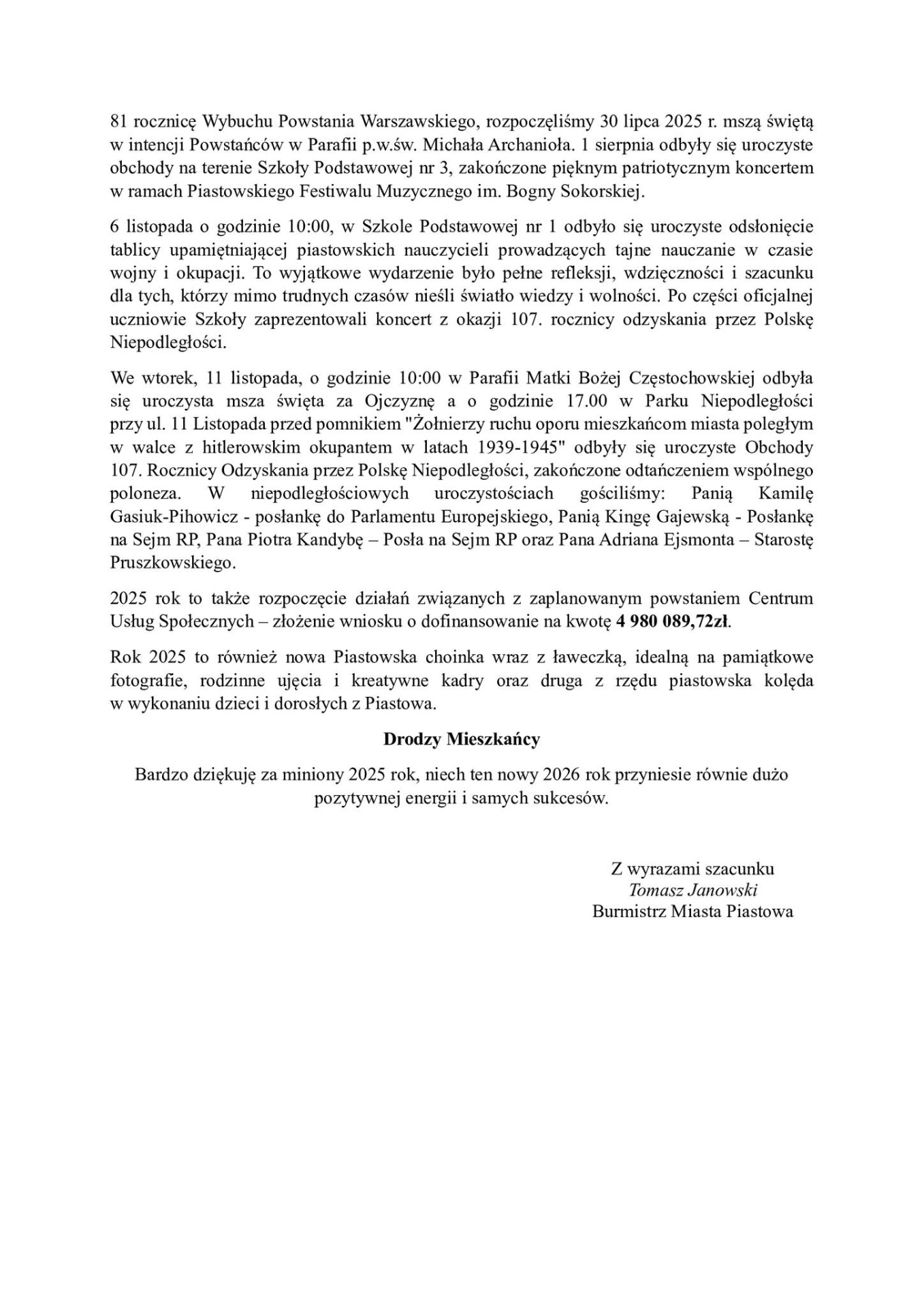 Tomasza Jankowskiego - Burmistrza Miasta Piastowa