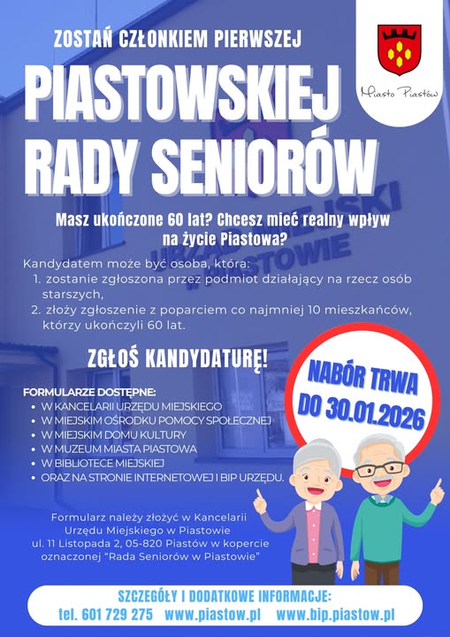 Wypełnione zgłoszenia należy składać do 30.01.2026 r. w kopercie z dopiskiem „Rada Seniorów w Piastowie” w Kancelarii Urzędu lub przesłać pocztą (decyduje data stempla).